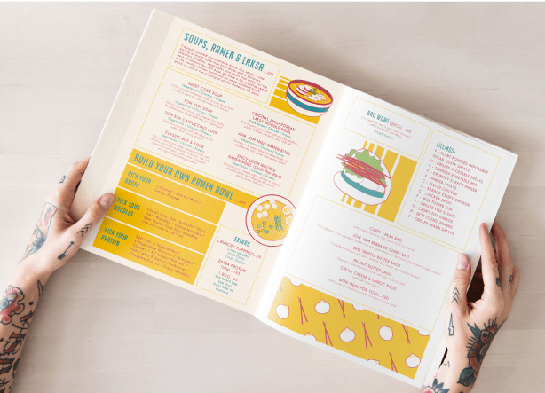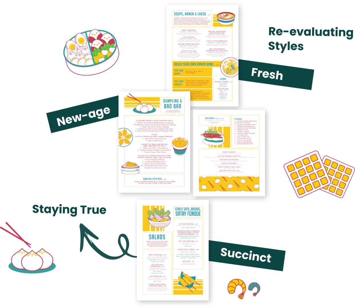 We at TRC are always ready for a challenge, and Jom Jom brought us just that. Known for their upscale Asian cuisine, they reached out for what seemed like a simple menu update. However, we quickly realized there was more to the story – Jom Jom was pivoting towards a casual, street-style food concept. This insight shifted our gears from a menu redesign to a comprehensive rebranding project.